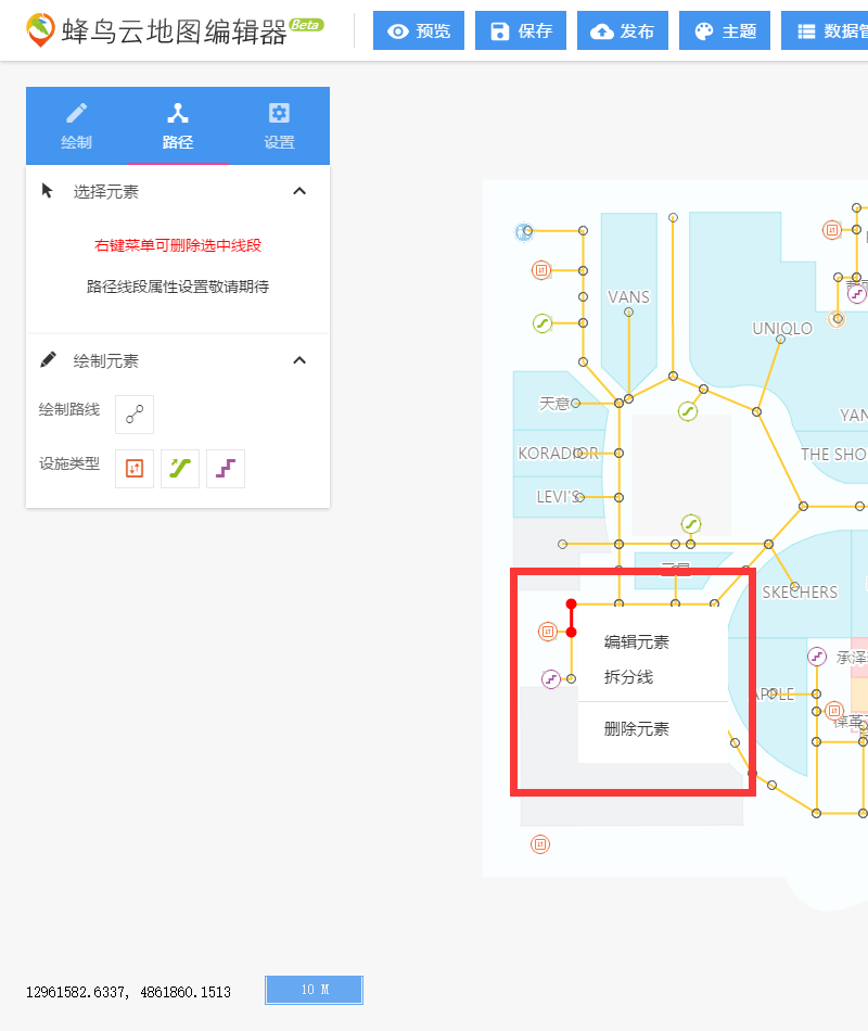 选择地图上的路径线,单击右键,出现“拆分线”、“删除元素”两个功能栏。